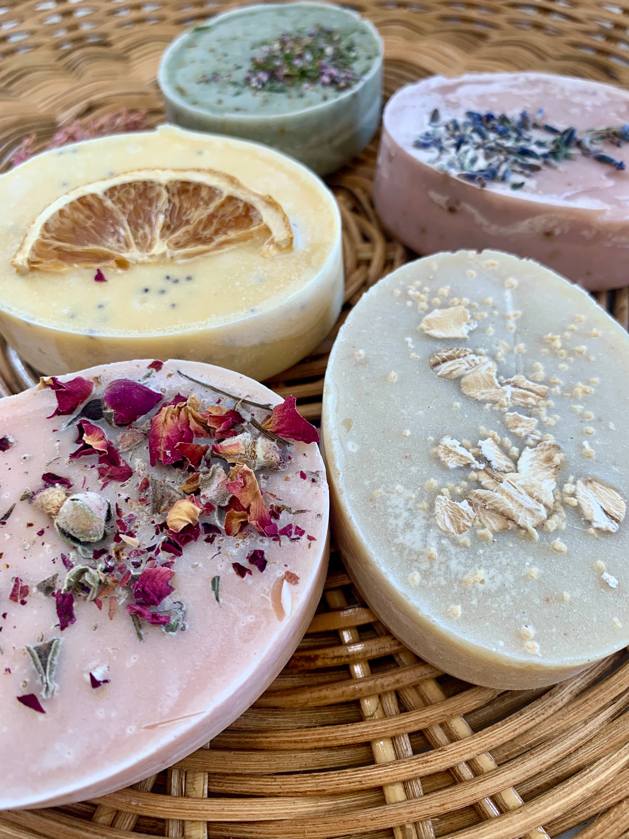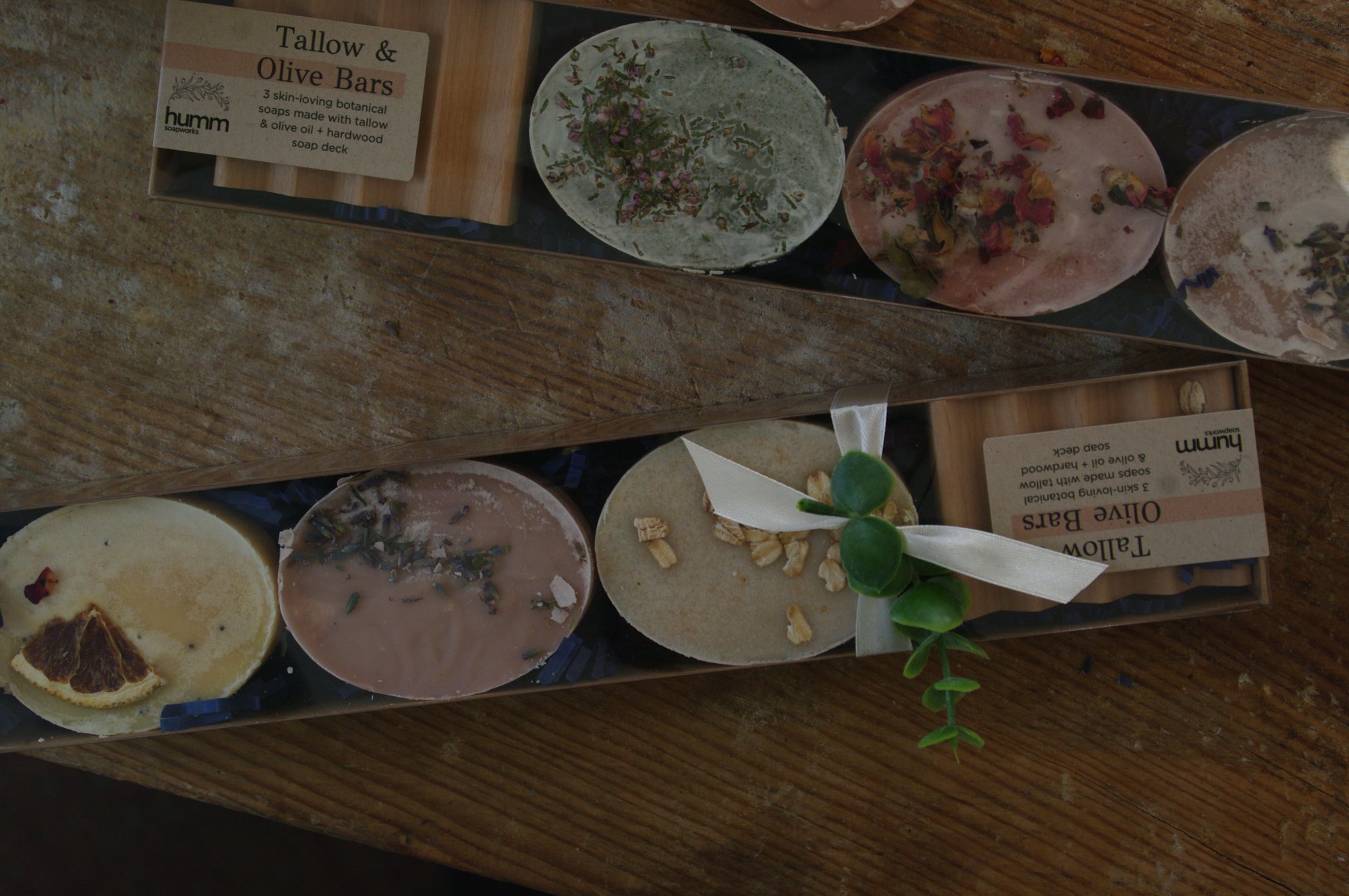 Three of our beautiful Tallow & Olive bars in a sweet gift set. Included is a mini hardwood soap deck so that this set is ready to go and complete. The selection of bars is curated for you making each set unique and beautiful.